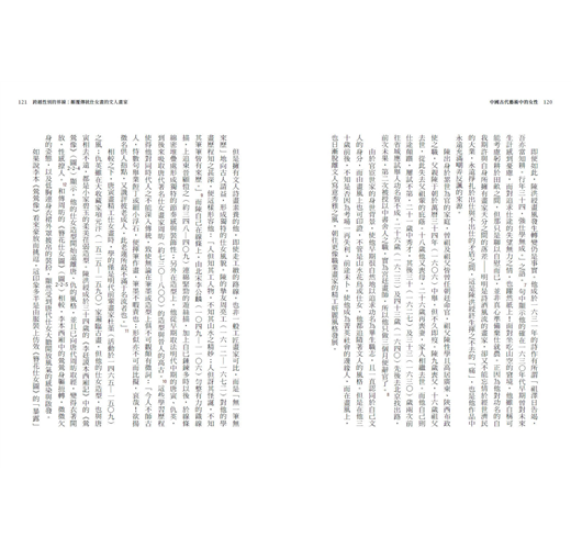然而從十七世紀後,本書所涵蓋的從董小宛、薛素素、柳如是,到席佩蘭、駱綺蘭、王玉燕,都成了創作者,且有畫跡傳於世,更不提二十世紀的潘玉良與董陽孜了。潘玉良繪畫題材與風格不但不亞於,且比同時期男性同儕更廣更深,董陽孜則使得無論創作書法時的爆發力或豪邁的氣勢,都不復成為男性的專利。