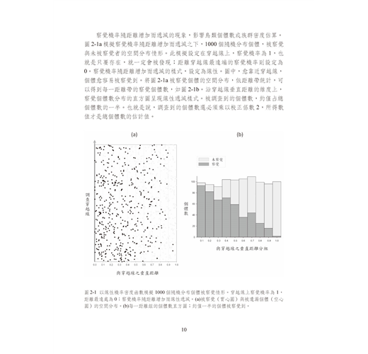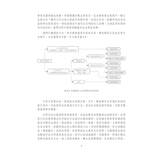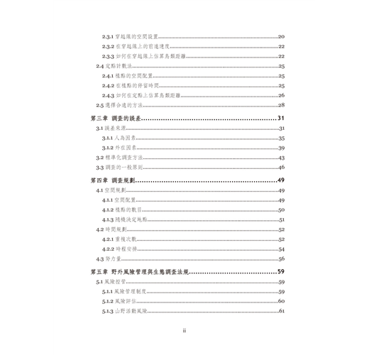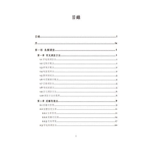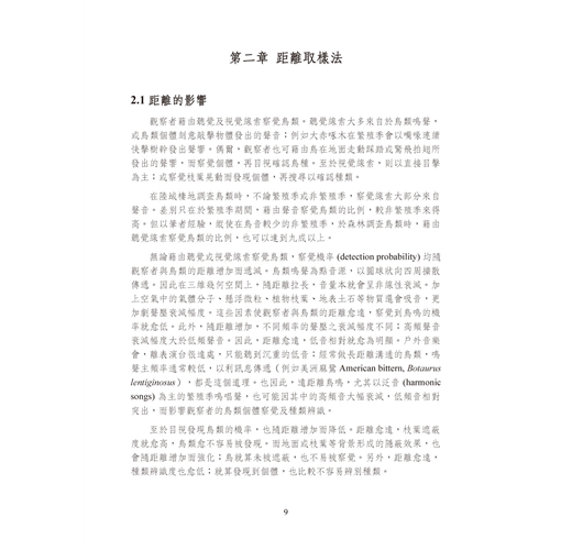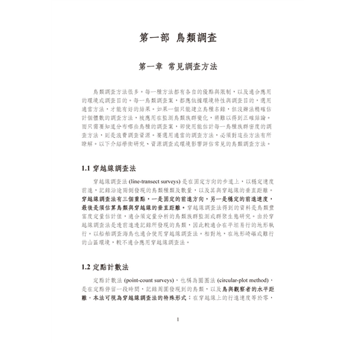 第一部介紹鳥類調查的各種方法,包括穿越線調查、定點計數、群集計數、地區搜尋等,並詳述距離取樣的理論基礎、操作方式與誤差來源。書中強調標準化調查流程與誤差控管,協助讀者提升資料品質與執行效率。