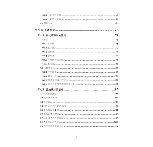 第二部聚焦於基礎資料分析方法,包括敘述統計,以及推論統計觀念及基本方法,例如平均值比較、相關、迴歸、卡方檢定等;不僅可協助鳥友與生態工作者分析調查所得數據,也適合作為大學的生物統計學入門教材。