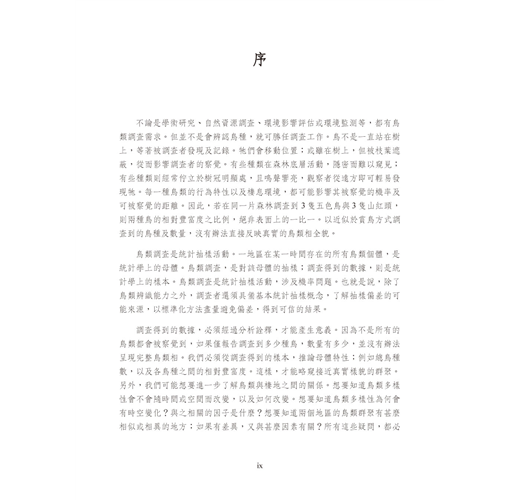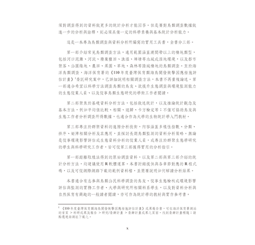 這是一本專為鳥類調查與資料分析所編寫的實用工具書,全書分三部。