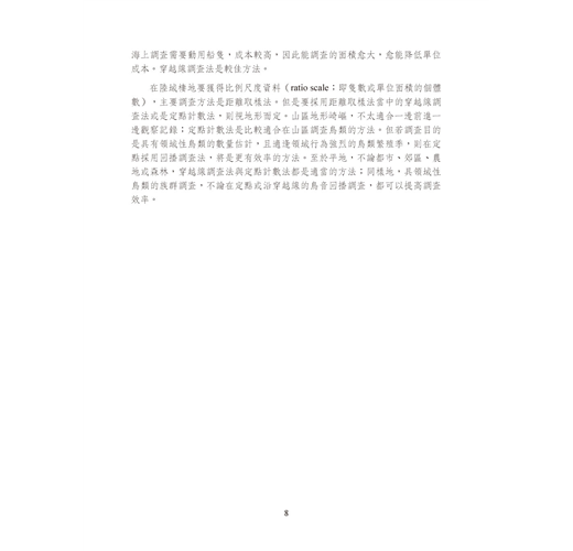 不論是學術研究、自然資源調查、環境影響評估或環境監測等,都有鳥類調查需求。但並不是會辨認鳥種,就可勝任調查工作。鳥不是一直站在樹上,等著被調查者發現及記錄。牠們會移動位置;或雖在樹上,但被枝葉遮蔽,從而影響調查者的察覺。有些種類在森林底層活動,隱密而難以窺見;有些種類則經常佇立於樹冠明顯處,且鳴聲響亮,觀察者從遠方即可輕易發現牠。每一種鳥類的行為特性以及棲息環境,都可能影響其被察覺的機率及可被察覺的距離。因此,若在同一片森林調查到3隻五色鳥與3隻山紅頭,則兩種鳥的相對豐富度之比例,絕非表面...