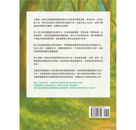 全書並附有豐富的 R 語言實作程式碼與範例資料,協助讀者將理論落實於分析工作中。不論是想提升調查設計與資料品質的鳥友、進行生態檢核的實務工作者,或需處理調查資料與撰寫報告的學生與研究者,本書皆為不可或缺的實用工具。