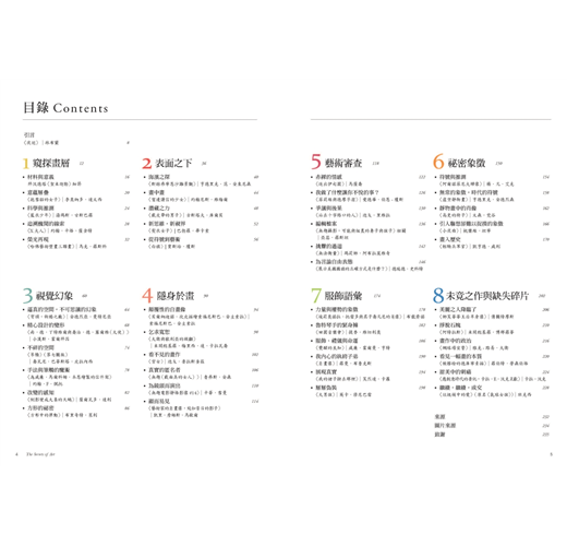 全書共八大章節,每一章節皆聚焦於一種獨特的探索方式,說明藝術史學家與科學家如何攜手合作,逐步揭開那些隨著時代流轉而被掩蓋、隱藏,甚至徹底抹去的真相。