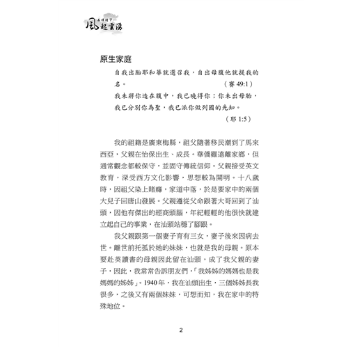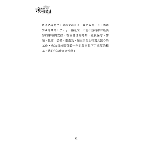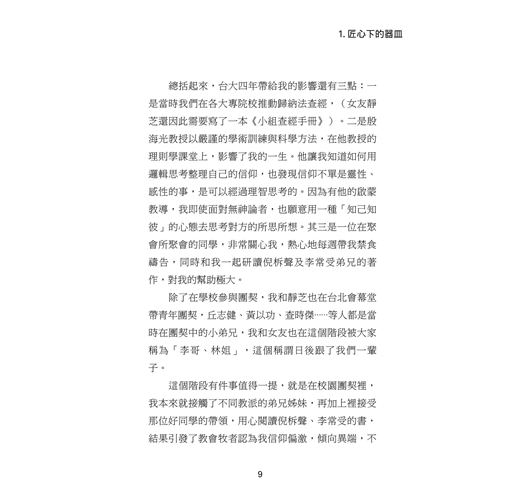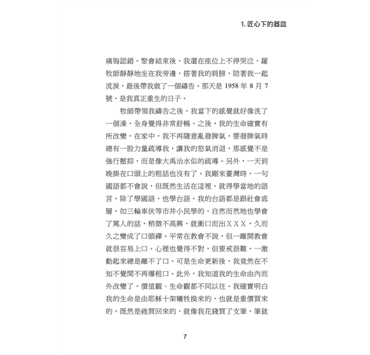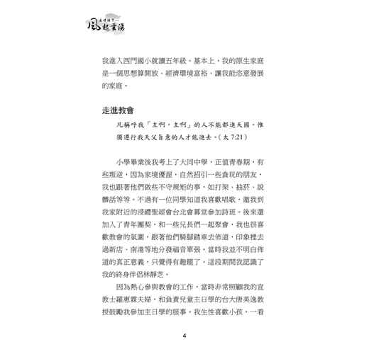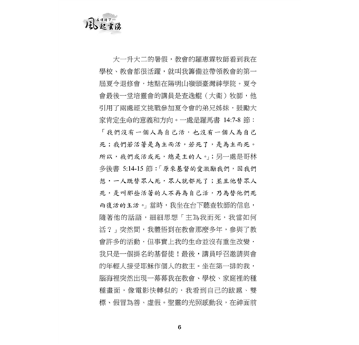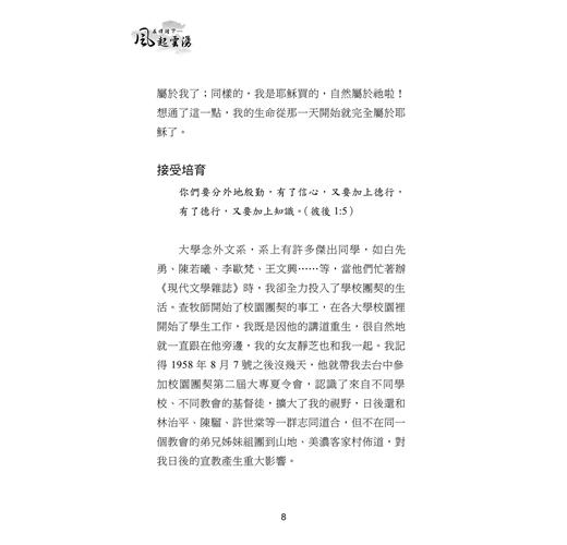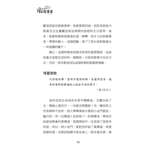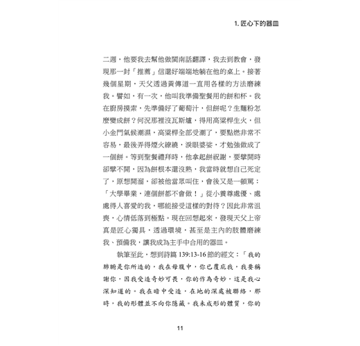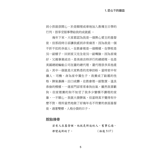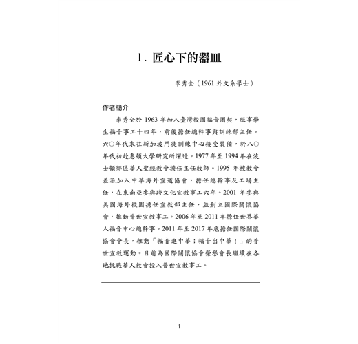 本書收錄三⼗位台⼤校友的真實⾒證,他們曾擁有令⼈羨慕的學業與職涯前景,卻因信仰選擇放下⾼薪與榮譽,投⼊全職事奉。從校園⽣活到職場歷練,從個⼈掙扎到靈命更新,他們的故事⾒證了神如何翻轉⽣命,賜下超越世俗的平安與喜樂。翻開本書,您將與這些⾒證者⼀同經歷信仰的挑戰與恩典,並重新思考何謂真正的成功與豐盛⼈⽣。