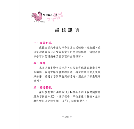 本人非常高興這次終於有機會能看到一本精挑365句台語俗諺的好書『台語每日一句──落台語俗諺很簡單』,不只將上面所列的經典俗諺列入,更精心挑選其他做人做事,甚至是親子、夫婦、同儕相處所必須了解的俗諺。讓讀者能在輕鬆有趣、沒有壓力的情形下每日學習一句,每天都能享受台語俗諺所帶來的生活趣味。而且這本書內容翔實,除了有詞句解釋、涵義說明外,也能針對台語俗諺加以闡釋,更將對應的華語、成語列出,有助於一般讀者的理解。