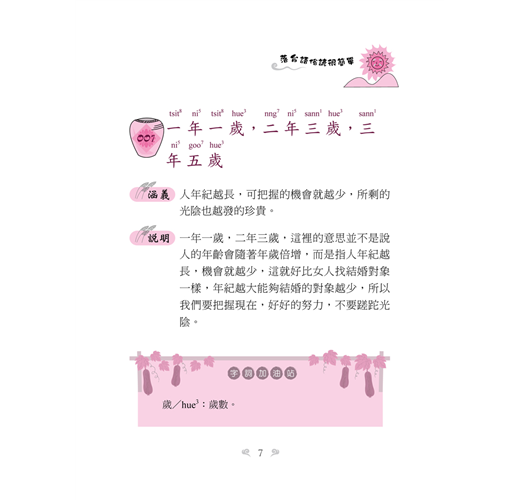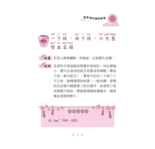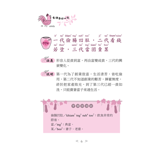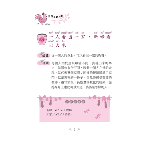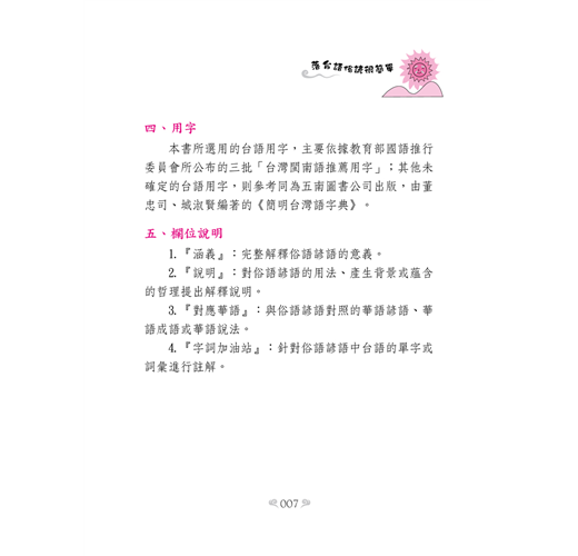 有鑑於此,我與同好盧玉雯小姐花了幾年的時間,將各自收集的佳句一一去蕪存菁,將它呈現於作品中。而且為了用字能夠和教育部一致,本書的台語用字都遵照教育部公布的字體使用,拼音亦然。相信有志於學習「台灣諺語」的讀者使用了這本書,在精進方面一定可以達到事半功倍的效果。