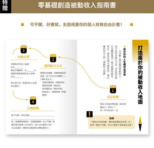 封面、內頁特別色印製,24頁,可平攤,好書寫。包含被動收入基本思維、打造屬於你的被動收入地圖:設計你的人生備用金流表,以及4種適合普通上班族的投資與變現指南、致富最重要的5大關鍵。你將可以運用在《零基礎創造被動收入》中學到的法則,全面規畫你的個人財務自由計畫!