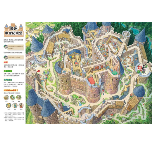 風靡臺、日、韓,最受小朋友喜愛的知識解謎繪本第19彈《城堡迷宮》來嘍!這次由城堡公園、登上天守閣、日本戰國山城、歐洲中世紀城堡、星形要塞、歐洲宮殿、宮廷舞會、伊斯蘭王宮、中國宮殿、古代的海港城、傳說的宮殿、龍宮等12座大型迷宮組成,讓你一次逛遍各個時代、世界各地的城堡。