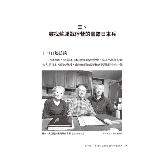 特別是如果沒有吳正男先生,我應該不會有這般勇氣去撰寫以臺籍日本兵的西伯利亞戰俘經驗為主題的論文,更遑論同步進行紀錄片的製作。經由陳力航的牽線,我才得以與吳正男先生取得聯繫,完成他與家人的訪談,這彷彿是他和陳以文先生與曾被拘留在西伯利亞的臺灣人之間,彼此建立情感後所留下的契機,因此讓後人在多年後,還有機會探究他們深藏內心的經歷與苦悶,我才能接觸許敏信、陳旺、湯守仁的家屬,除了訪談,也取得許多未公開資料,在此要特別感謝吳正男先生、陳明亮先生、陳力航先生、許瑞洋女士、許瑛子女士、林瑛理加女士、許嘉宏先生、陳淑娃女士、湯進賢先生,如果沒有他們,我極有可能在寫作過程中「半途而廢」。接著要感謝我的論文指導教授何義麟老師,他是我在撰寫論文的漫漫長路上,一盞最亮明燈。另外,李筱峰老師、蘇瑞鏘老師的建議與提點,以及在北教臺文就讀期間所有老師的指導,給予我這個紀錄片出身、沒有受過歷史學訓練的影像工作者,太多太多的養分。感謝協助蒐集、翻譯日文及俄文文獻的高譽真小姐、安德先生、凃文慈老師,以及為本書寫推薦序的有光健先生,在紀錄片製作期間給予許多協助與建議。最後,感謝紀錄片製作團隊和我的家人,他們的支持與包容,讓我感受到在艱難道路上前行時,永遠不是一個人。