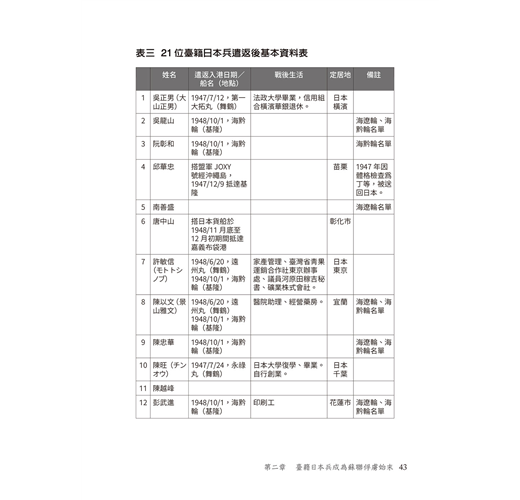 一、從蘇聯地區遣返的臺籍日本兵名單