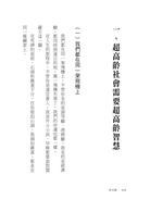 二○二五年,全球約有四分之一的國家開始人口負成長,臺灣將進入超高齡社會,二○二五年一月的數據顯示,六十五歲以上的人口數,占總人口的百分之十九點二七,隨著老年人口比例的不斷攀升,未來的社會福利與醫療支出將大幅增加,勞動力的緊縮將對經濟成長產生深遠影響。除了公部門持續擴充醫療及照顧服務能量,導入智慧科技,創造健康及照護新模式等作法之外,人們更應該有超高齡智慧。