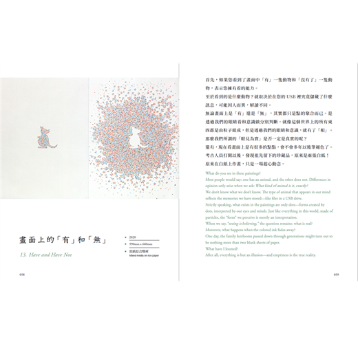 無論畫面上是「有」還是「無」,其實都只是點的聚合而已。是透過我們的眼睛看和意識做分別判斷。就像這個世界上的所有東西都是由粒子組成,但是透過我們的眼睛和意識,就有了「相」。