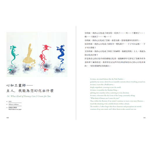 〈皮影戲之舞〉原本只是描繪一個空舞的身影,卻在反覆凝視中發現,那片大片留白,其實從未空無;又如〈花果山之戰〉,表面是神話鬧劇,內裡卻隱喻著我們內心不斷交鋒的「真我」與「假我」。