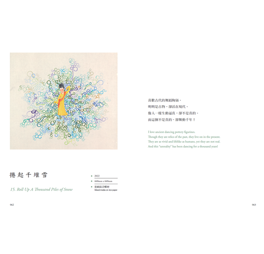 其中,令我感動的必然是在真實的心向中,注入其靈性的藝術家,真正表現出深邃而豐沛的情思者,作品所展現光彩,必成亮麗的彩虹。因而,欣賞王卉娟博士出版《千年的邀請》畫冊之後,而有上述的感應,在心緒澎湃之際,則有稍許的心境陳述。