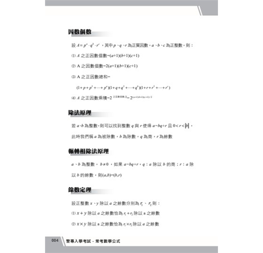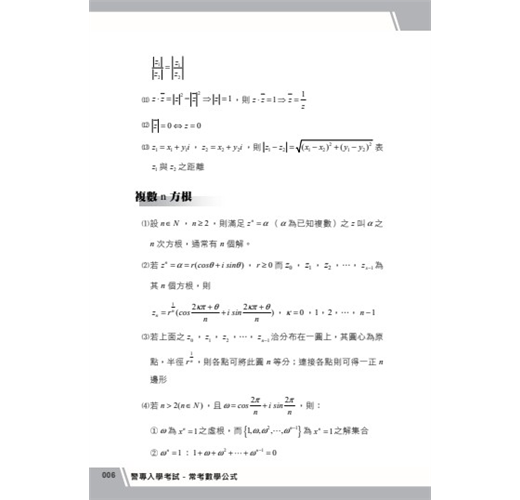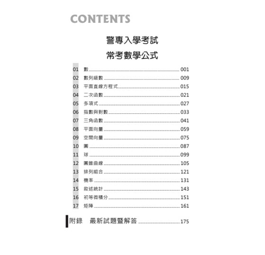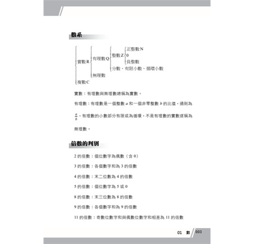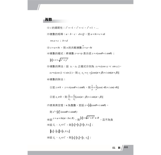 3.全書以分章編列方式整理數學常見與必考的公式與觀念,涵蓋「數」、「數列級數」、「平面直線方程式」、「二次函數」、「多項式」、「指數與對數」、「三角函數」、「平面與空間向量」、「圓與球」、「圓錐曲線」、「排列組合」、「機率」、「統計」、「初等微積分」到「矩陣」等共17大主題。每章皆以條列式整理公式重點,清晰有序,便於快速檢索與複習。