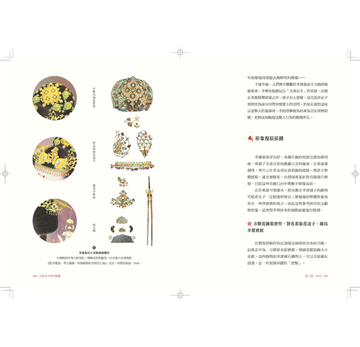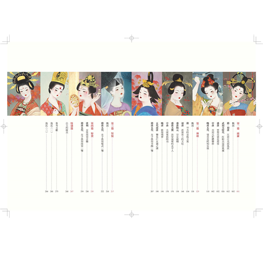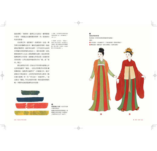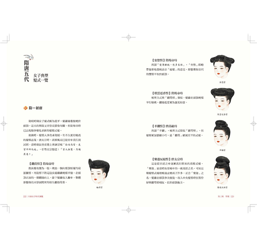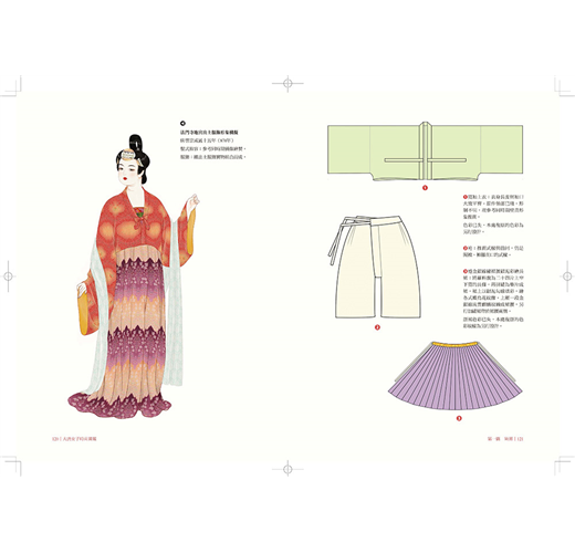 全書年代雖年代上溯至隋,下及五代橫跨四百年時光,但分成綺羅(服裝)、琳琅(首飾)、粉黛(妝容)、髻鬟(髮式)四篇章有序梳理。在服裝方面唐朝更細分為初唐、武則天時代、盛唐、中唐、晚唐,並將武周時期單獨列出說明,清晰的脈絡搭配大量的實物圖片、精美插繪與古文描述,兩相對照、一讀就懂。
