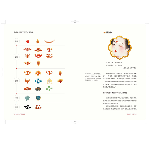 書中收錄了大量首次公開的唐代服飾實物資料,透過文史詩詞與出土文物的嚴謹考據與對照,作者嘗試以唐朝當代人們的視角,解讀還原隋唐至五代近四百年間,中國女性在妝容、服飾、首飾與髮式方面最為細緻入微的潮流演變。