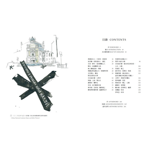 本書中的畫,都完成於二○二二年三月以及二○二三年三月至四月,我去了基輔、哈爾基夫、伊久姆(Izium)、布查(Bucha)、敖得薩(Odesa)、克拉馬托爾斯克(Kramatorsk)、波爾塔瓦(Poltava)、斯洛維揚斯克(Sloviansk)。隨附的文字記錄,涵蓋了一個世紀以來塑造烏克蘭人民與國界的歷史,都是當事人的親身見證,來自我邊畫邊採訪所得。有時為了清楚起見,這些敘述經過編輯,或者與其他人的敘述相核對。所有受訪者均選擇具名。
