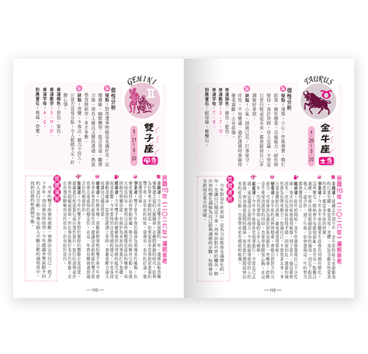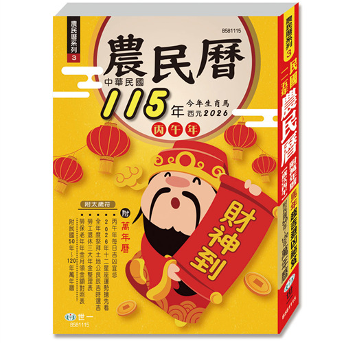 由易經八卦推衍而來的農民曆,數千年來一直是人們日常生活行事的參考.本書由知名命理大師劉銘泓先生精心編撰,收錄每日宜忌;十二生肖運勢;陽宅風水;命相學等.更特別整理出目前勞工最關心的勞工退休三大年金整理表;國民年金保費金保費金額表;勞工退休金提繳工資分級表;健保保費金額表;勞保老年年金月領對 照和婚喪喜慶常用賀詞;保健知識;民國50-120年萬年曆等,內容豐富實用.隨書附贈太歲符
