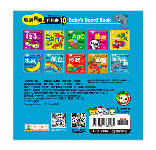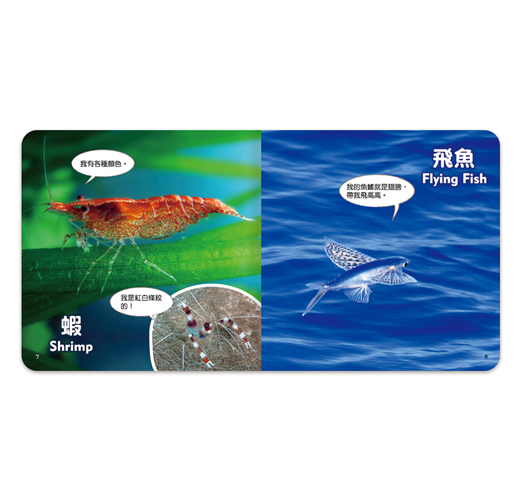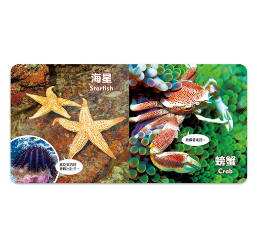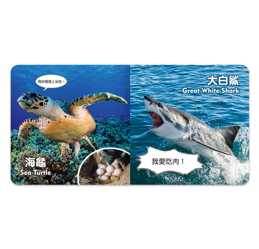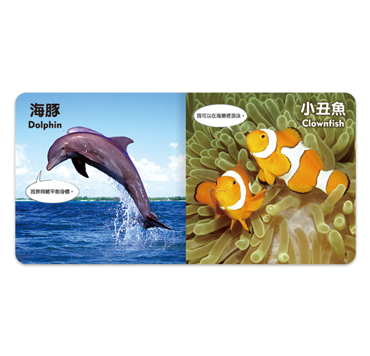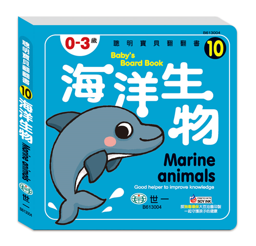 本書介紹海洋生物,每個海洋生物皆有特色和圖片,以及中英文名稱,色彩鮮豔 圖案可愛,符合孩子視覺感官發展的需求.特殊的加厚紙材印刷,好翻,不易撕 破,讓0~3歲的孩子天天樂在學習.