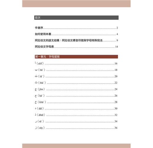 歡迎各位讀者親臨阿拉伯文的世界!標準阿拉伯文的歷史悠久,乘載豐富的文明遺產。如今,這門語言亦是世界上22個阿拉伯國家的官方語言,57個伊斯蘭國家、17億穆斯林在宗教上的共同語言。有鑑於穆斯林人口每年持續增加,可以預見的是,標準阿拉伯文使用的人口勢必與日俱增,所以其重要性自然不言而喻。如果有人想深入理解阿拉伯國家的種種卻不得其門而入時,我認為學習書面阿拉伯文便是那把打開阿拉伯文化之門的祕密鑰匙。如果想獲得這把鑰匙,那就從接觸阿拉伯文字母開始吧!且讓阿拉伯文字母的魅力,像乳香的謎樣氣味、或是像異國情調的阿拉伯音樂一般,勾起你一探阿拉伯文化祕境的渴望!