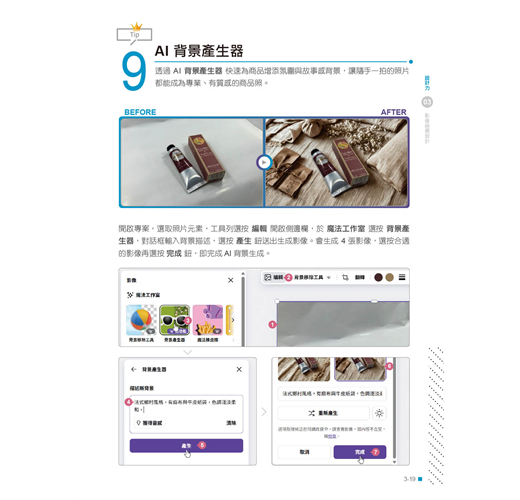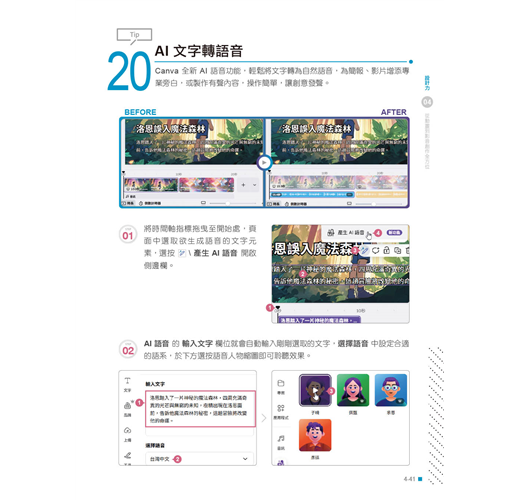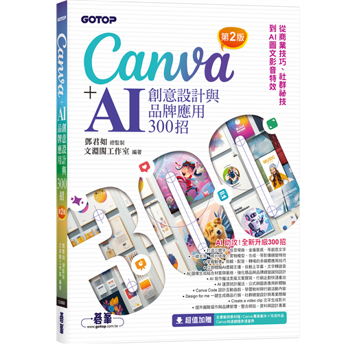 從設計與專案管理入門,進階到文字風格、影像合成、動畫剪輯與互動內容等十大主題,本書帶你全面掌握Canva × AI的創作魔法。