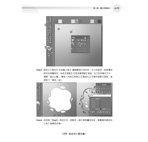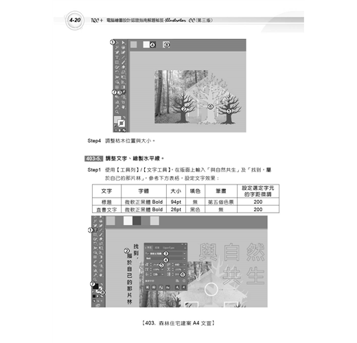 3.操作題型範例題目提供4大類40題,教您由淺入深的學習Illustrator CC最新之功能,包含「基礎圖形繪製能力」、「圖文表現能力」、「圖文整合設計能力」及「圖文應用能力」,以實際作品範例透過設計功能剖析,提供讀者在解題過程中學習Illustrator CC最實用的技巧,提升電腦繪圖設計能力。
