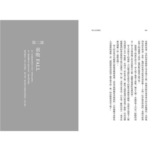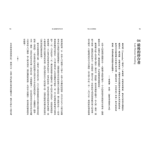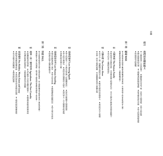 作者從古人類的起源談起,帶領讀者回到三百多萬年前的東非平原,逐步建構出人類如何成為地球的主宰;智人驅逐了所有其他人屬物種,憑藉農業、科技與組織擴張到地球的每個角落——然而,正是這種前所未有的成功,讓人類自身成為生態系統中最危險的不穩定因子!