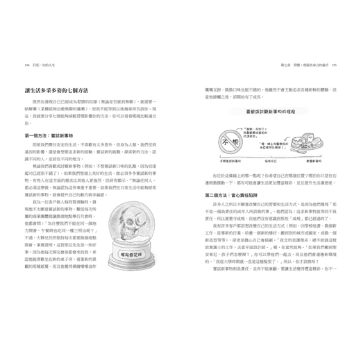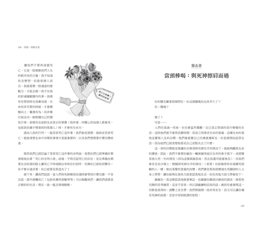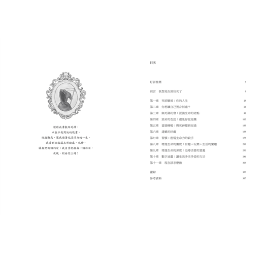 很少看到談論生死攸關的書可以這麼幽默風趣!此書對於該如何好好的活,給出了相當明確又實用的建議,讓我獲益良多。作者不流於俗套的觀點與獨具的巧思,令人欽羨!——愛瑞克/《內在原力》系列作者、TMBA共同創辦人