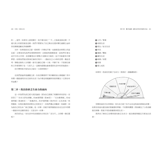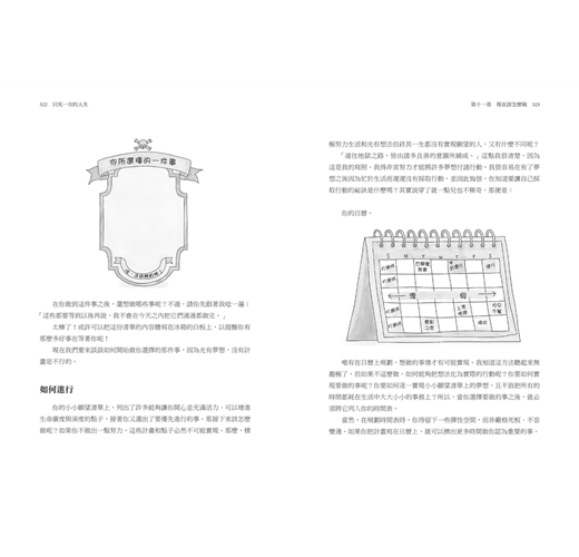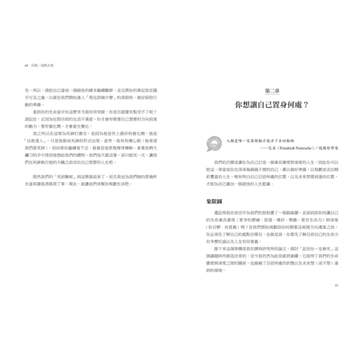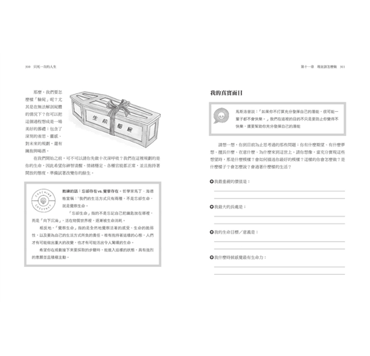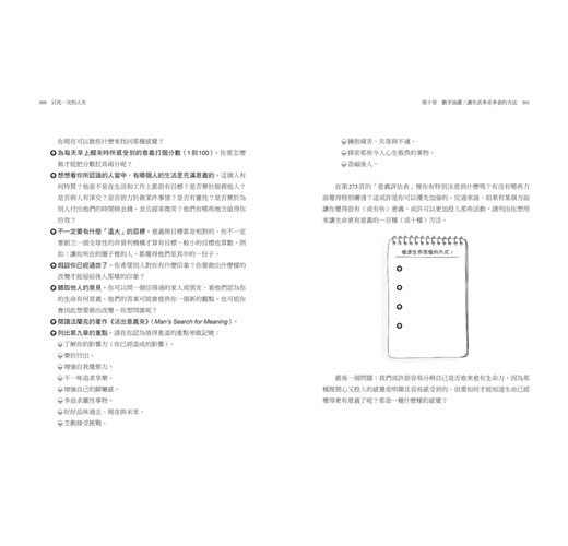 ‧最後,我們將逐一列舉你可以採取哪些行動來點燃生命的火焰,同時有效回顧檢視。我不知道你們是不是跟我一樣,不過我超討厭那種心裡充滿夢想、點子和靈感卻不確定該如何付諸行動的感覺。那就像是參加了一次精彩的腦力激盪會議,但之後卻不知道下一步該怎麼做,並懷疑那些精彩的點子是否會跟著自己一起進棺材。因此,我不會讓你們在讀完這本書後雖然得到了一些答案,有了一些夢想,卻不知何去何從!我們會幫助你擬定明確具體的步驟,讓你能夠在死神上門之前過著兼具廣度和深度的精彩人生。