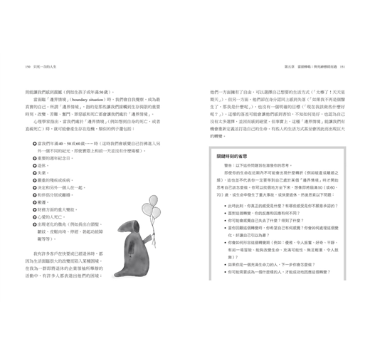 ‧接著,我們會掘開傳說中的死亡之墓:讓你了解「記住你一定會死」這句話可能對你的生命產生怎樣的影響、為什麼我們通常會避免談論死亡,以及我們可以從那些直視死亡的人身上學到什麼。此外,我們也會找出那些扼殺你的生命的習慣,以及之後可能會讓你感到遺憾的事,藉以幫助你思考要如何過下半輩子。