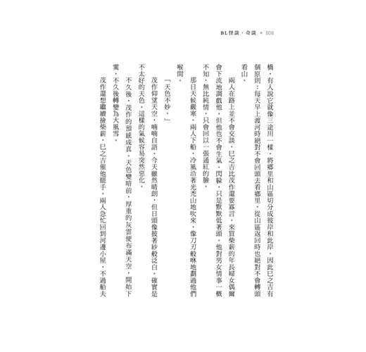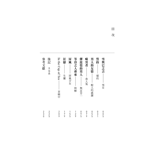 日本妖怪文學鼻祖,東洋恐怖美學起源小泉八雲的《怪談.奇談》,取材自日本流傳已久的民間奇譚,其深厚的文學底蘊,揉合以人為本的世界觀,影響後世無遠弗屆。本書忠實改編其中九篇故事,由從小視BL為人生支柱,志在打破「僵硬而無趣」性別框架的王谷晶操刀改寫。述說人類與非人物種交流的幽微愛情,內容與風格豐厚多變──糾葛的悲戀、情深似海的熱戀,被慾望吞噬的貪戀……古典的優美韻味,血脈賁張的曖昧滋味,風格獨具的BL奇譚初登場!