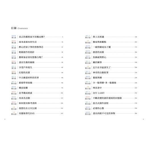 「藝術創作」、「藝術工具」、「日常」、「藝術問答」四個面向,分享在藝術路上的掙扎與領悟,既談理念與方法,也細細描繪對街景與日常的關懷,展現他作為完美主義創作者與資深文具迷的敏銳觀察。