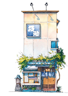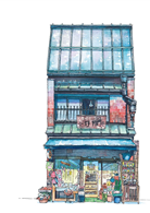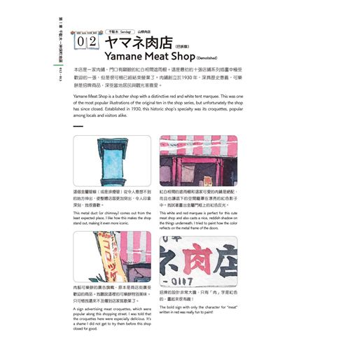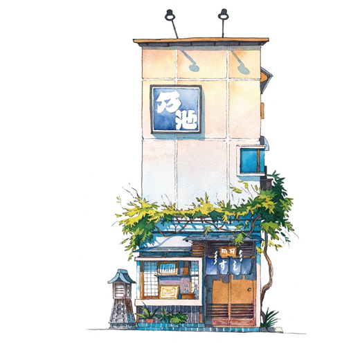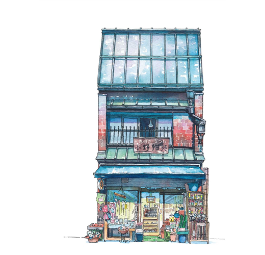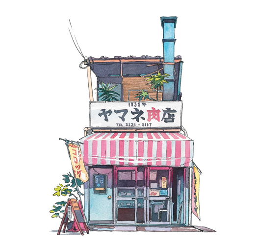 出身動畫業界、擅長營造氛圍場景的他,將筆觸從幻想轉向現實,透過50幅水彩細膩記錄東京老舖的建築輪廓與歲月痕跡,帶領我們走入巷弄深處,重溫那些被時代掩蓋的懷舊風景。