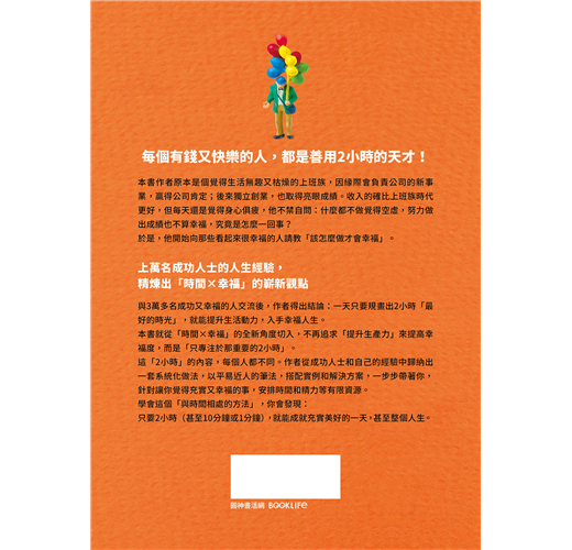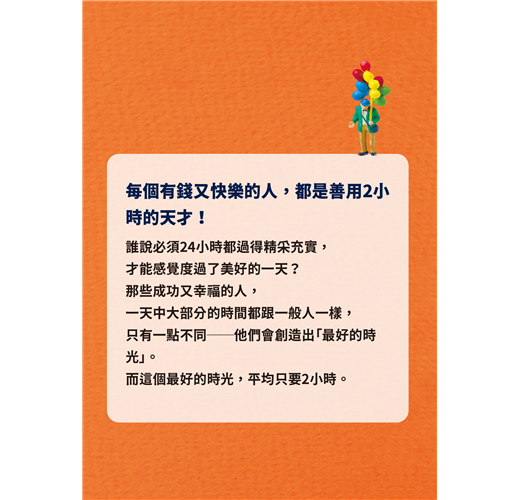 與3萬多名成功又幸福的人交流後,作者得出結論:一天只要規畫出2小時「最好的時光」,就能提升生活動力,入手幸福人生。