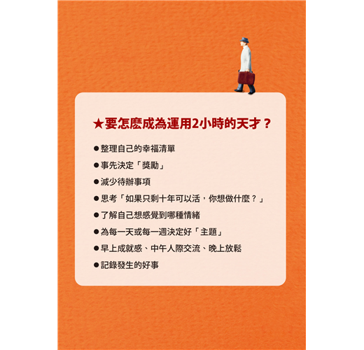 這「2小時」的內容,每個人都不同。作者從成功人士和自己的經驗中歸納出一套系統化做法,以平易近人的筆法,搭配實例和解決方案,一步步帶著你,針對讓你覺得充實又幸福的事,安排時間和精力等有限資源。