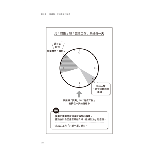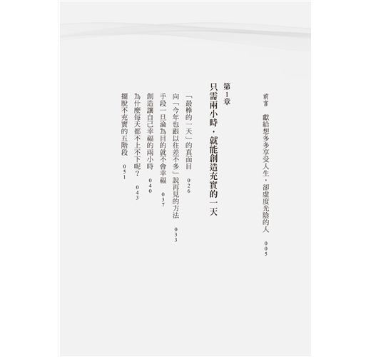 本書就從「時間×幸福」的全新角度切入,不再追求「提升生產力」來提高人生幸福度,而是「只專注於那重要的2小時」。