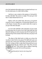 我們很容易看見,為什麼神如此安排。神實在願望更新我們,使我們像他。但我們沒法辦到。除非我們將他的愛慕,作為我們的愛慕,我們就不能有他的性情;除非在愛慕裏獻上我們自己,我們就不能慢慢的像基督那樣「長遠活著為我們祈求。」那些已經奉獻了的信徒確能達到這種生活。