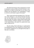 傳講愛是絕對必要的,神有時許可將苦難臨到,使基督徒因從心中看出罪惡可怕的權勢而退縮,基督詔示「彼此相愛」的命令是何等重要,若以基督的愛去愛人,必能活出聖潔的生活。