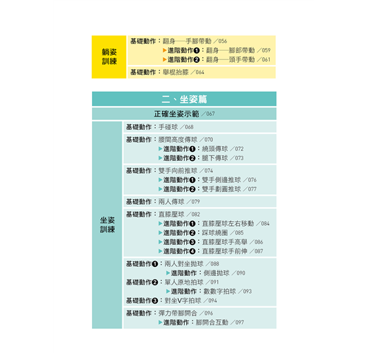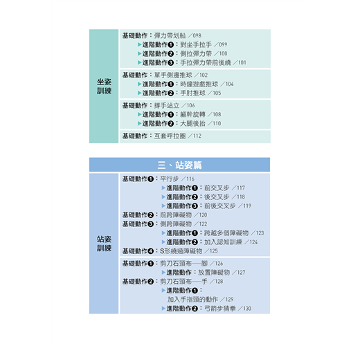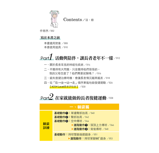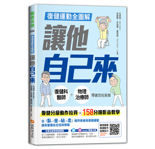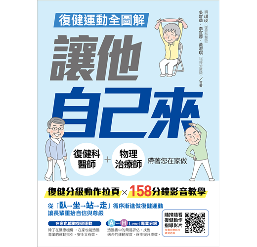 書中所有運動均有教學影片,內容涵蓋復健科醫師診間評估與自我程度判斷,再由治療師逐步示範。影片標註「適合程度」、「訓練目的」、「使用的輔具」、「補充說明」、「常犯的錯誤動作」等,清楚易懂,立即上手。