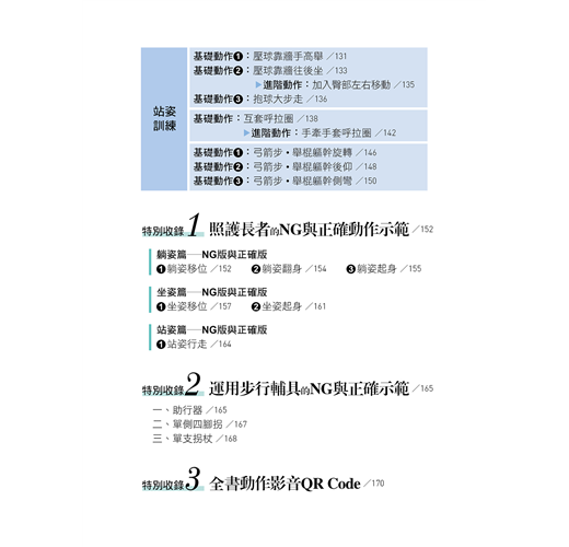 書中不僅提供正確動作的示範與重點提醒,還特別標示常見的NG姿勢與易犯錯誤,並附上修正建議與注意事項,幫助讀者在復健過程中更加安全、有效。