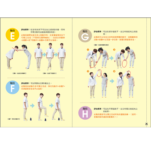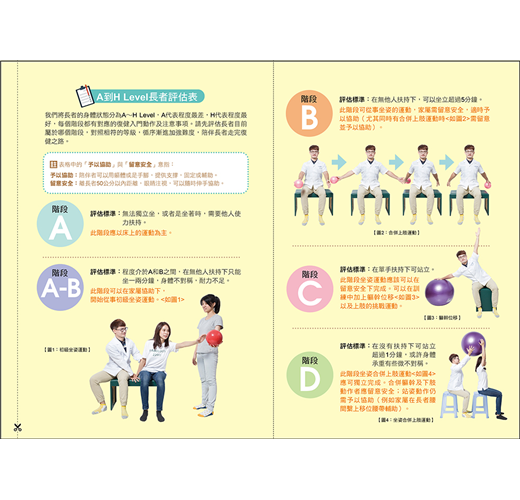書中將運動強度分成A~H等級(A代表程度最差,H代表程度最好),並附簡易自評表,依據身體狀態從合適的運動程度開始,逐步提高強度,才不會容易受傷,並且持續看見成效與進步。