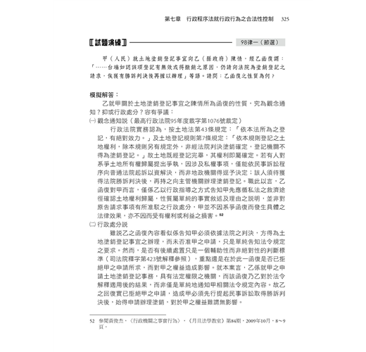 本書試著重新建構一個「白話式」的行政法學習架構,讓考生們能較平易的親近行政法。採用大量搭配考題模擬演練之體例,藉此鋪陳重要學說、實務見解,並由「問題與實例」的不斷提出,來堆砌章節的內容,藉此不斷衝擊讀者的大腦思考,以深刻閱讀印象。