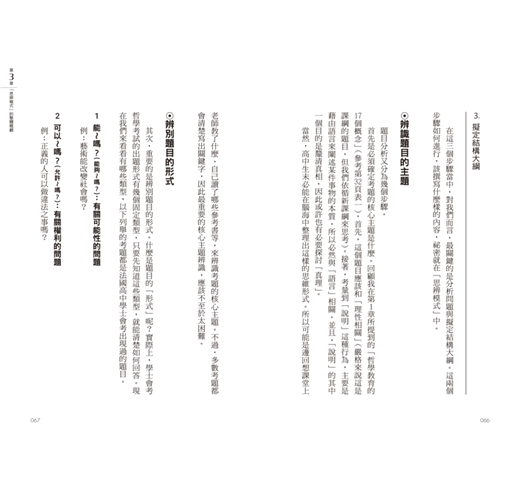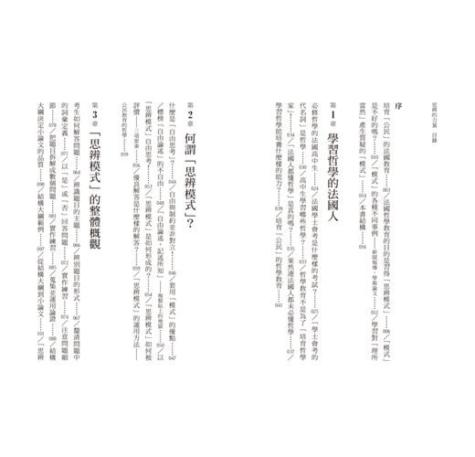 最後一章是應用篇,我將帶大家看看「思辨模式」如何運用在哲學以外的層面。另外,也一起思考如何回答在法國學士會考的哲學考試中,較為罕見的問題形式。