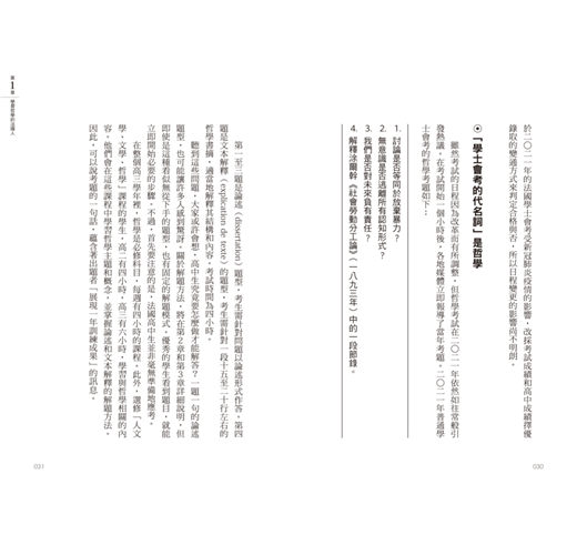 為什麼這個印象並不正確呢?事實上,學士會考哲學考試並不是檢視學生能否「自由思考」的考試,也不是單純書寫「意見」或「感想」的考試。從這個意義上來說,與日本的小論文或讀書心得完全不同。在日本的寫作教育中,不受形式束縛的思考,以及能表現出寫作者個性和感性的作品,往往會受到高度評價。如果以這種先入為主的觀念來看學士會考哲學考試的題目,或許會認為考生必須透過文章表達自由且具有創造性的思考。
