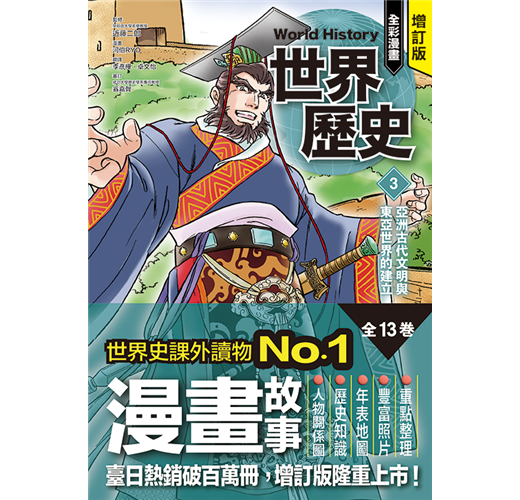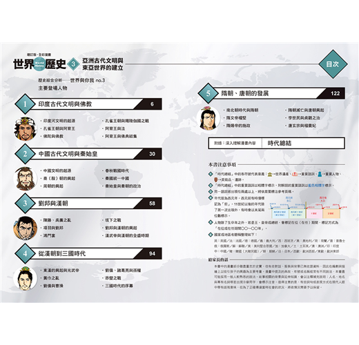 《增訂版全彩漫畫世界歷史.第3卷:亞洲古代文明與東亞世界的建立》全書分為「漫畫故事」與「歷史知識」兩個部分,更在進入漫畫故事前,特別設計「歷史綜合分析」和「主要登場人物」兩個單元。