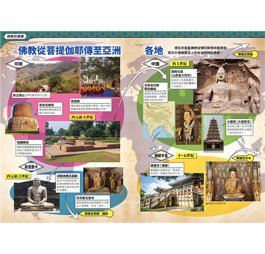 「歷史綜合分析」藉由精采的全彩照片,圖説佛教與儒家思想的誕生,以及在印度、中國、朝鮮半島、日本、西藏、泰國和緬甸等地的影響,讓讀者在閱讀前先行掌握相關背景;而「主要登場人物」以圖解標示出漫畫故事裡的角色身分和立場,讓讀者更好了解他們之間錯綜複雜的關係。