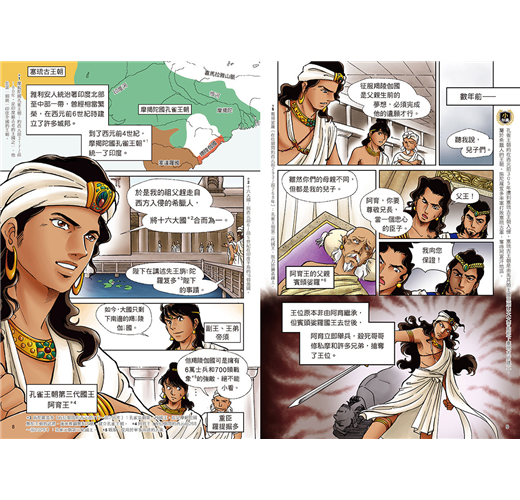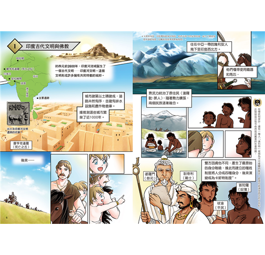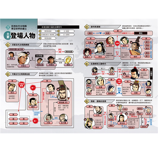 「漫畫故事」為全書的主軸,以歷史劇場呈現,並加入注解和趣聞。聚焦亞洲,從印度河文明的起源,講述到黃河、長江流域上的中國朝代更迭,一幕幕演出孔雀王朝受佛教影響的治國思維、秦王政從人質之子躍變為始皇帝、項羽和劉邦之戰、三國時代英雄競逐、隋唐盛世興衰等情景;並透過阿育王、秦始皇、漢武帝、劉備和曹操、隋文帝、唐太宗等一國之君,再現亞洲古文明發展的重要時刻。