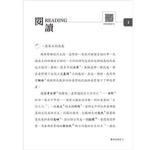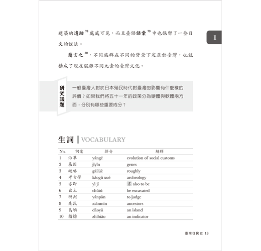 本書每一講皆包含課文閱讀,以及與主題相關、類似Podcast的聽力練習,此兩部分均附有生詞、拼音、英文註解以及語法解說等內容,以便學習者於增進知識之外,同步提升華語閱讀能力與聽力技巧。