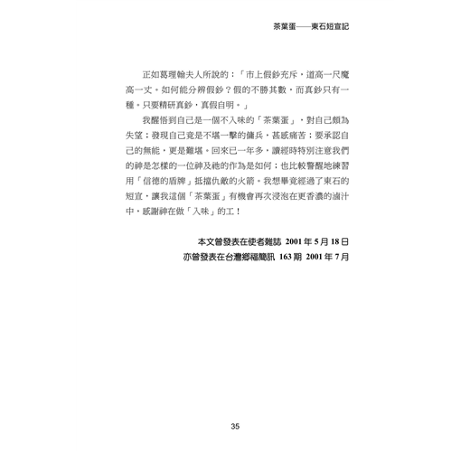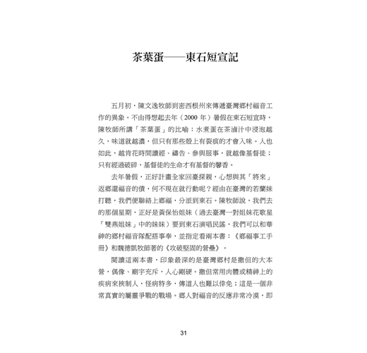 五月初,陳文逸牧師到密西根州來傳遞臺灣鄉村福音工作的異象。不由得想起去年(2000年)暑假在東石短宣時,陳牧師所講「茶葉蛋」的比喻:水煮蛋在茶滷汁中浸泡越久,味道就越濃,但只有那些殼上有裂痕的才會入味。人也如此,越肯花時間讀經、禱告、參與服事,就越像基督徒;只有經過破碎,基督徒的生命才有基督的馨香。